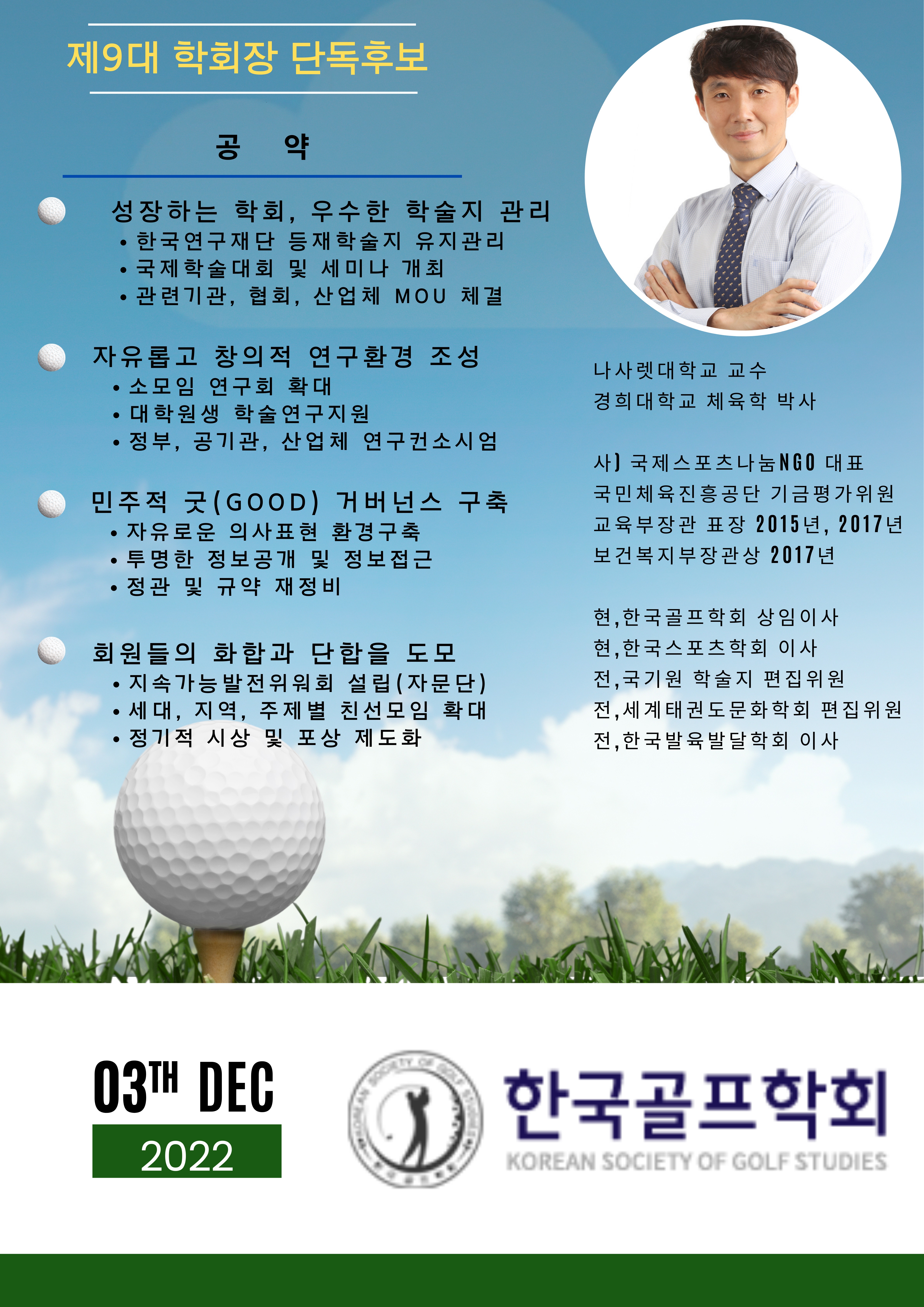 안녕하십니까 한국골프학회 선거관리위원회에서 알려드립니다. 한국골프학회 제9대 학회장 후보를 다음과 같이 알려드립니다. 단독 후보 : 김정모(나사렛대학교/교수) 감사합니다. 한국골프학회 선거관리위원회 배상 ![]() |