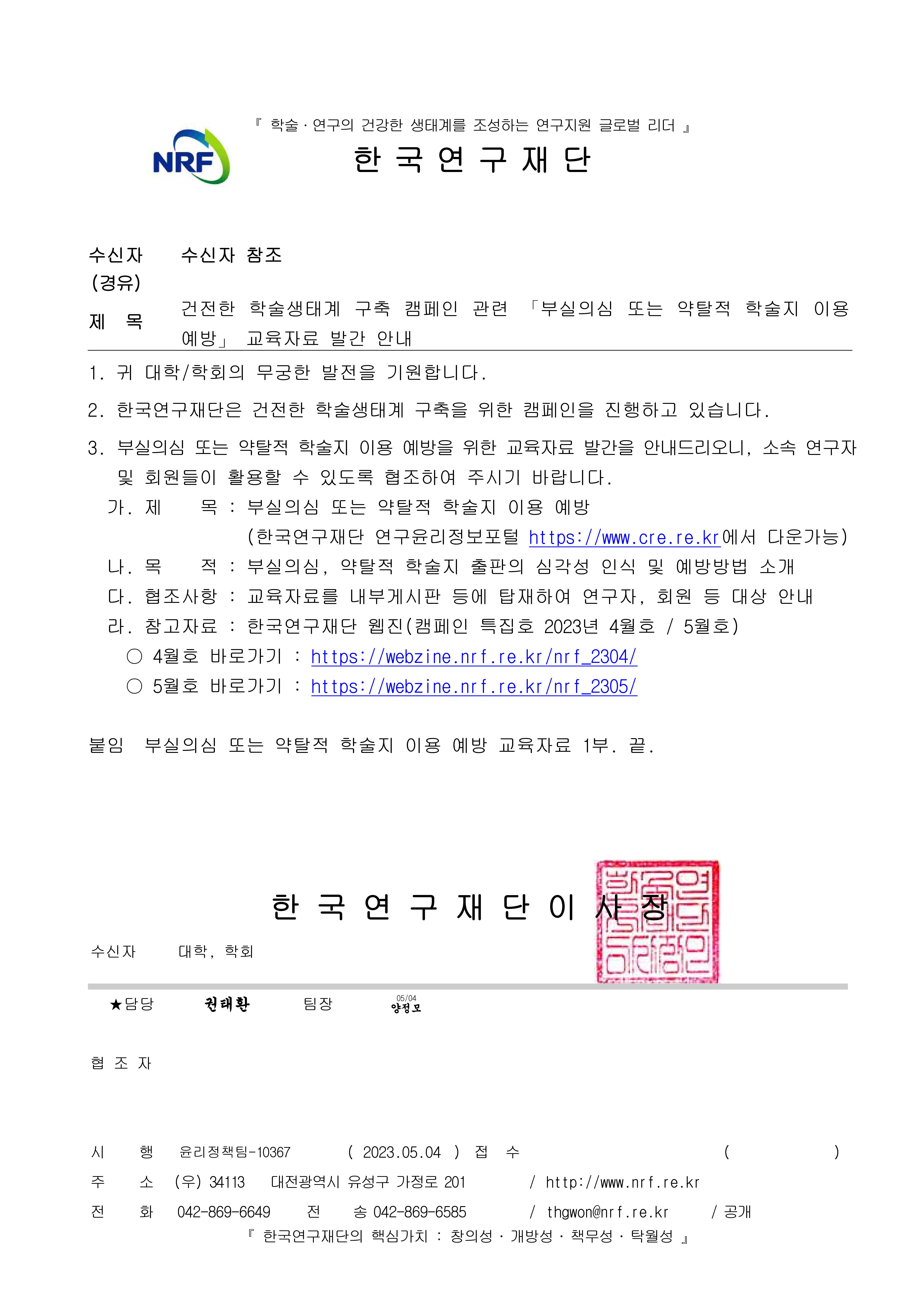 안녕하십니까 한국골프학회 편집국입니다. 부실의심 또는 약탈적 학술지 이용 예방을 위한 교육자료 발간을 안내드리오니 회원 여러분들의 많은 활용 바랍니다. 감사합니다. ![]() |